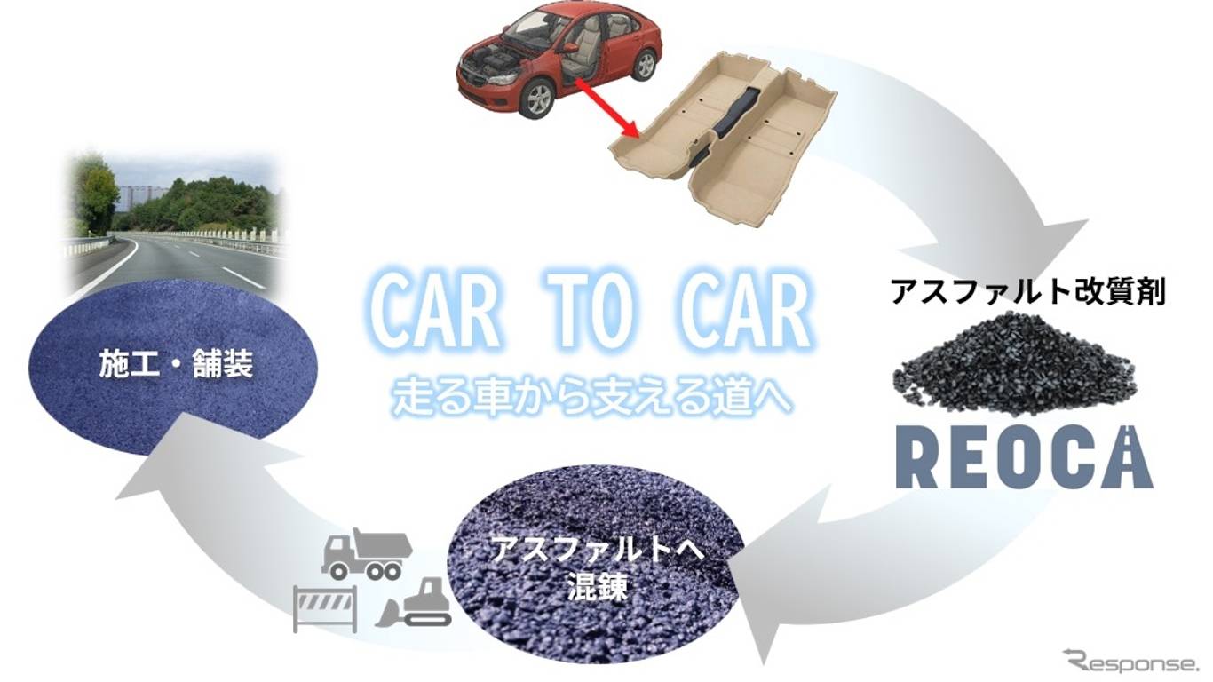 Проект реализован в сотрудничестве с Toyota Boshoku. Суть решения — превратить сложный композит не в «топливо для печи», а в сырьё, которое реально работает в инфраструктуре. Компания описывает это как расширенный цикл «Car to Car»: из автомобильного салона — в материал для будущих дорог.