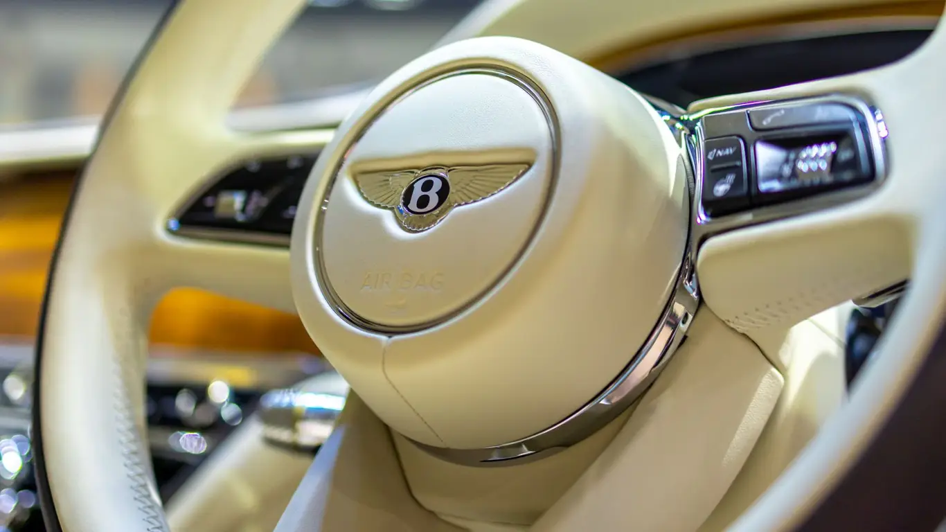 Автомобиль представлен в роскошной комплектации Mulliner, включающей широкий набор уникальных опций. Салон выполнен в элегантных тонах Linen и Imperial Blue, создавая атмосферу изысканности и комфорта. Внутренние элементы, такие как отделка черным Grand Black с накладками Mulliner и консоль с алмазной фрезеровкой, придают автомобилю эксклюзивный вид. Передние сиденья имеют вентиляцию, функцию массажа и подогрев с раздельным управлением.